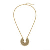 Le Collier Imani est une pièce de caractère qui impose sa présence par un design à la fois antique et résolument moderne. Son pendentif en demi-lune, orné de motifs circulaires et de détails perlés, évoque les boucliers de cérémonie et la puissance protectrice du soleil.